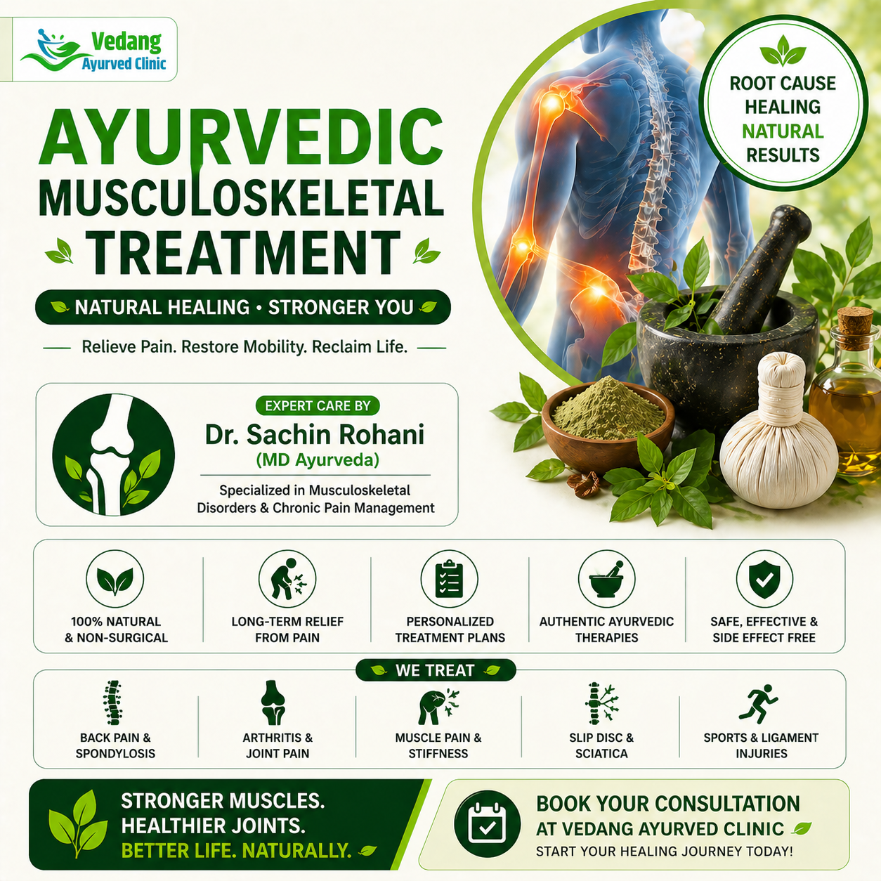 Struggling with muscle pain, joint stiffness, back pain, or mobility issues? Get effective, non-surgical relief with expert ayurvedic musculoskeletal treatment at Vedang Ayurveda Clinic, under the care of Dr. Sachin Rohani (MD Ayurveda)—trusted for delivering long-lasting results through authentic Ayurvedic therapies.