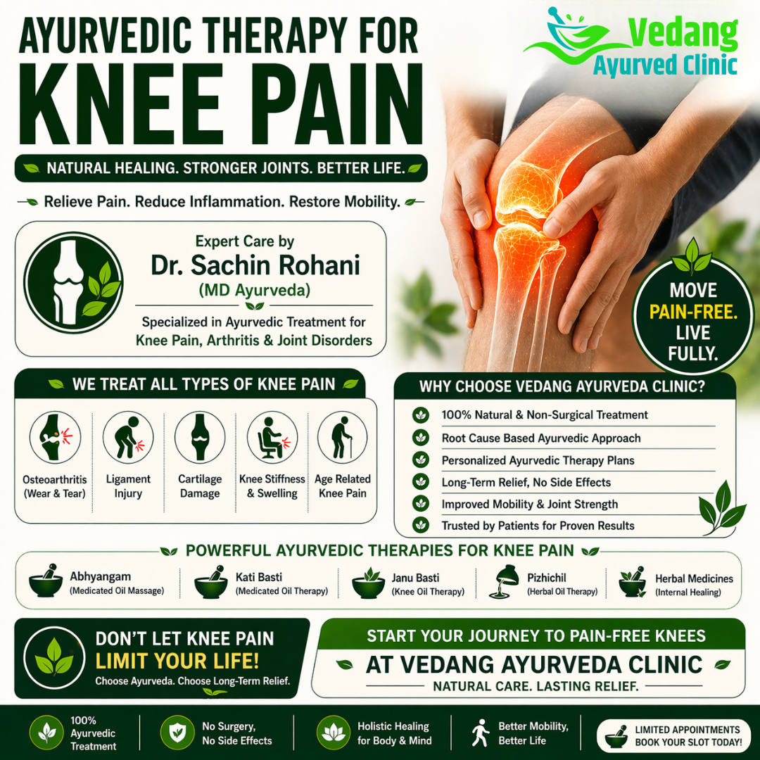 Struggling with knee pain while walking, climbing stairs, or sitting for long hours? Get effective and natural Ayurvedic therapy for knee pain at Vedang Ayurveda Clinic under the expert care of Dr. Sachin Rohani (MD Ayurveda).