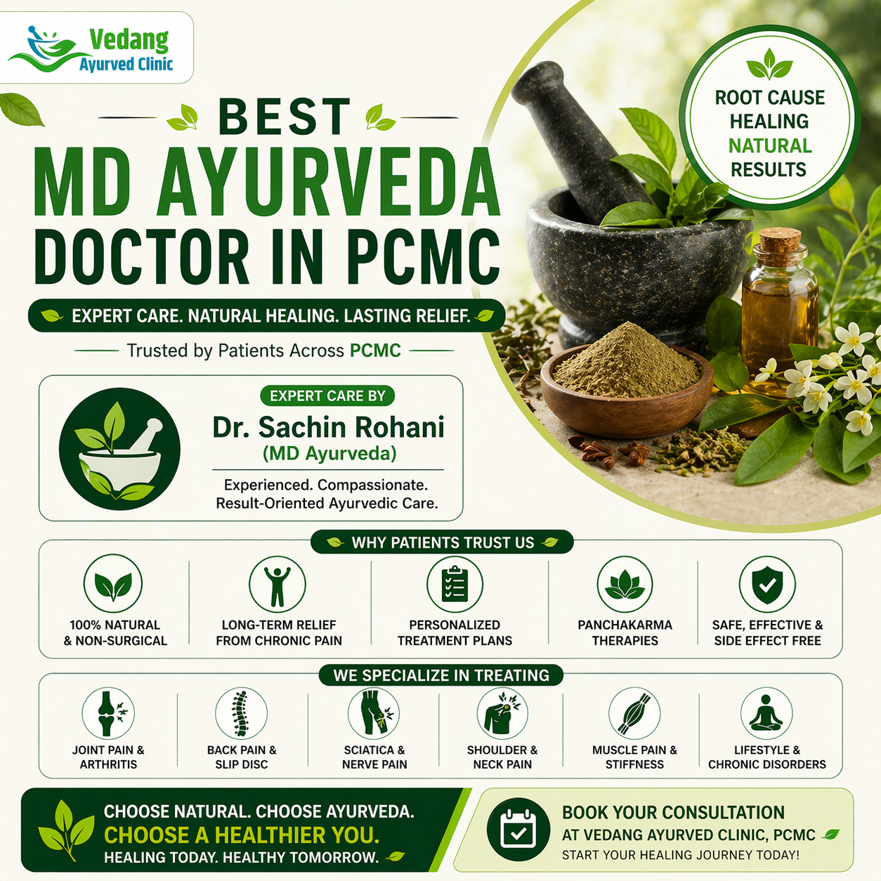 Searching for the best MD Ayurveda doctor in PCMC? Experience expert, result-driven care at Vedang Ayurveda Clinic under Dr. Sachin Rohani (MD Ayurveda)—trusted for delivering long-lasting relief from joint pain, back pain, arthritis, sciatica, and chronic lifestyle disorders.