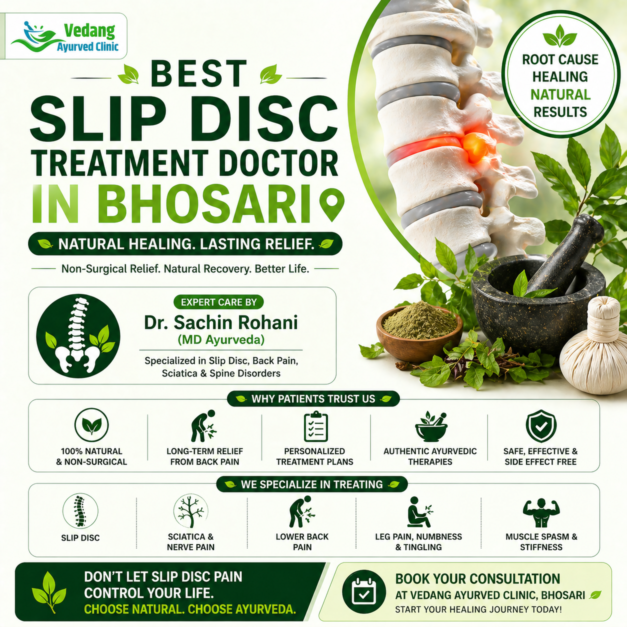 Struggling with severe back pain, sciatica, or a slipped disc? Get effective, non-surgical care from the best slip disc treatment doctor in Bhosari at Vedang Ayurveda Clinic, led by Dr. Sachin Rohani (MD Ayurveda)—trusted for delivering long-lasting relief through authentic Ayurvedic therapies.
