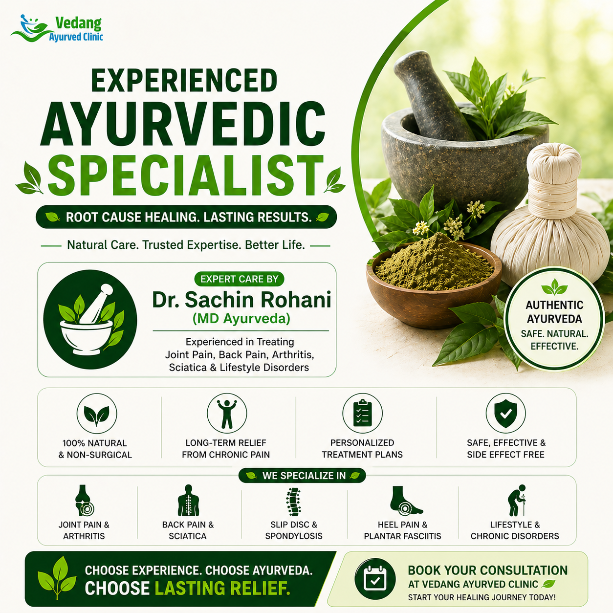 Looking for an experienced Ayurvedic specialist you can trust for lasting, natural healing? At Vedang Ayurveda Clinic, Dr. Sachin Rohani (MD Ayurveda) offers expert, result-driven care for joint pain, back pain, arthritis, sciatica, and chronic lifestyle disorders.