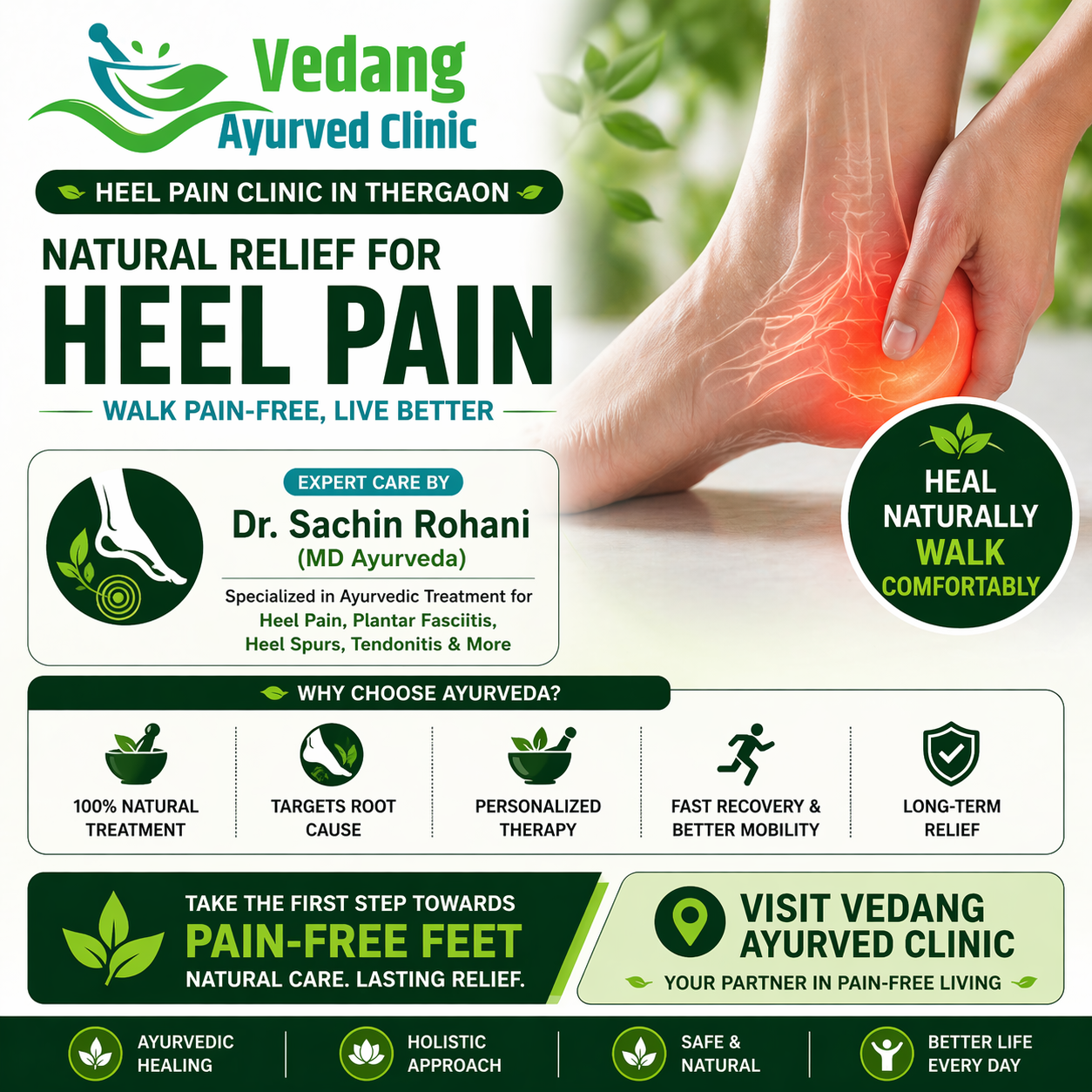 Looking for a trusted heel pain clinic in Thergaon? Get effective, non-surgical treatment at Vedang Ayurveda Clinic under the expert care of Dr. Sachin Rohani (MD Ayurveda), known for providing long-lasting relief from heel pain through authentic Ayurvedic therapies.