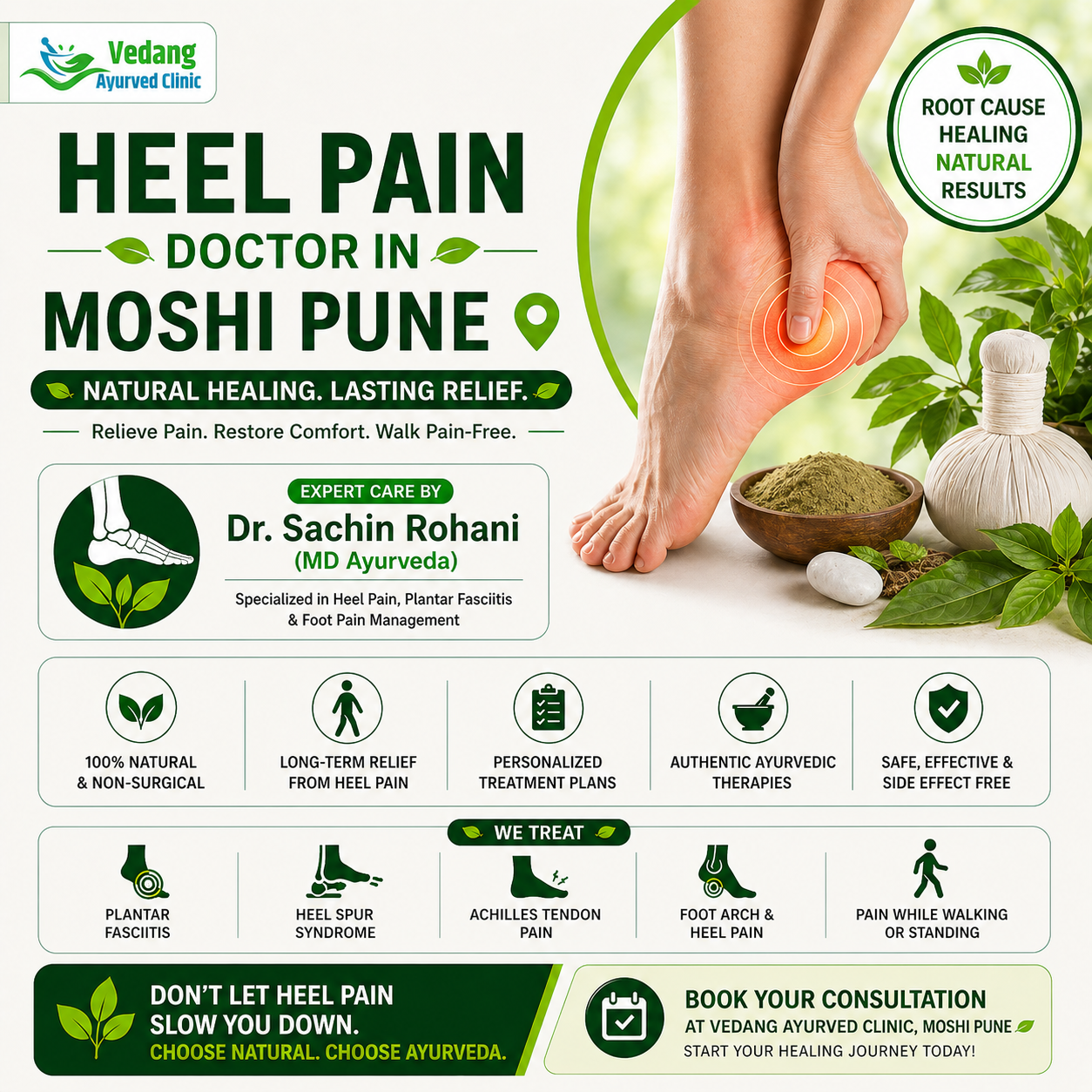 Struggling with sharp heel pain, plantar fasciitis, or difficulty walking? Get expert, non-surgical care from a trusted heel pain doctor in Moshi Pune at Vedang Ayurveda Clinic, led by Dr. Sachin Rohani (MD Ayurveda)—known for delivering long-lasting relief through authentic Ayurvedic treatments.