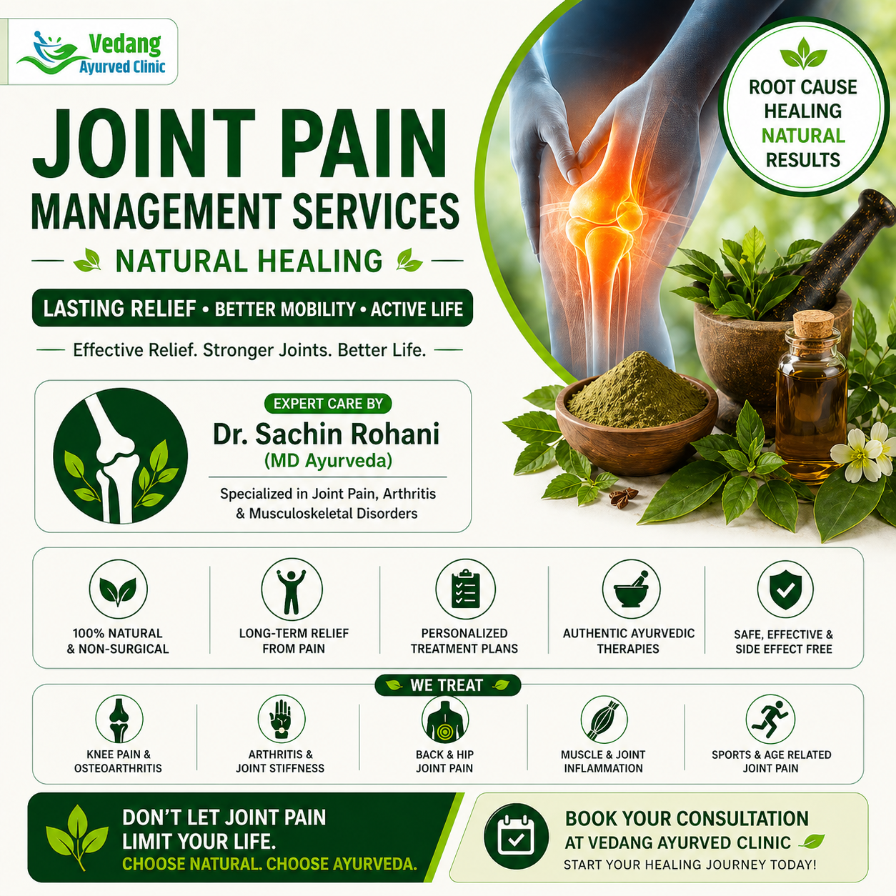Struggling with knee pain, arthritis, stiffness, or chronic joint discomfort? Get effective, non-surgical relief with expert joint pain management services at Vedang Ayurveda Clinic, led by Dr. Sachin Rohani (MD Ayurveda)—trusted for delivering long-lasting results through authentic Ayurvedic care.