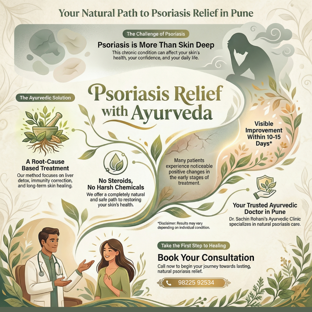 🌿 Chronic psoriasis can affect your skin, confidence, and daily life. At Dr. Sachin Rohani’s Ayurvedic Clinic, we offer natural, root-cause based psoriasis treatment in Pune, focused on liver detox, immunity correction, and long-term skin healing.
