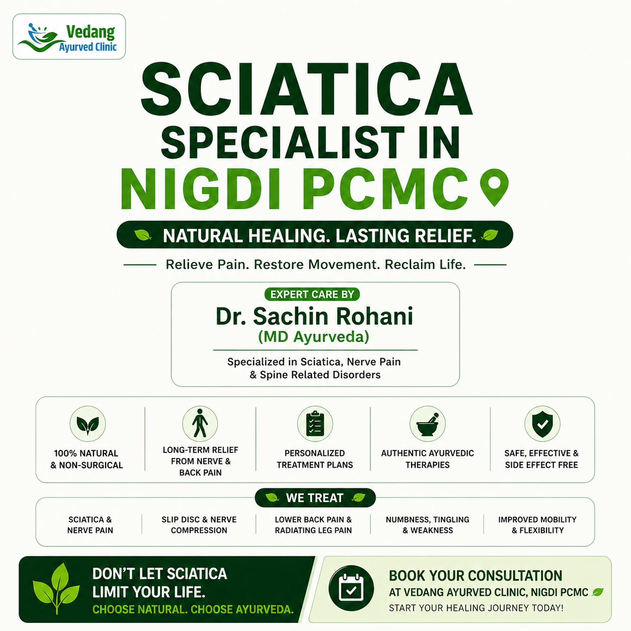Suffering from sharp leg pain, lower back discomfort, or numbness due to sciatica? Consult a trusted sciatica specialist in Nigdi PCMC at Vedang Ayurveda Clinic, led by Dr. Sachin Rohani (MD Ayurveda)—known for delivering effective, non-surgical relief through authentic Ayurvedic care.