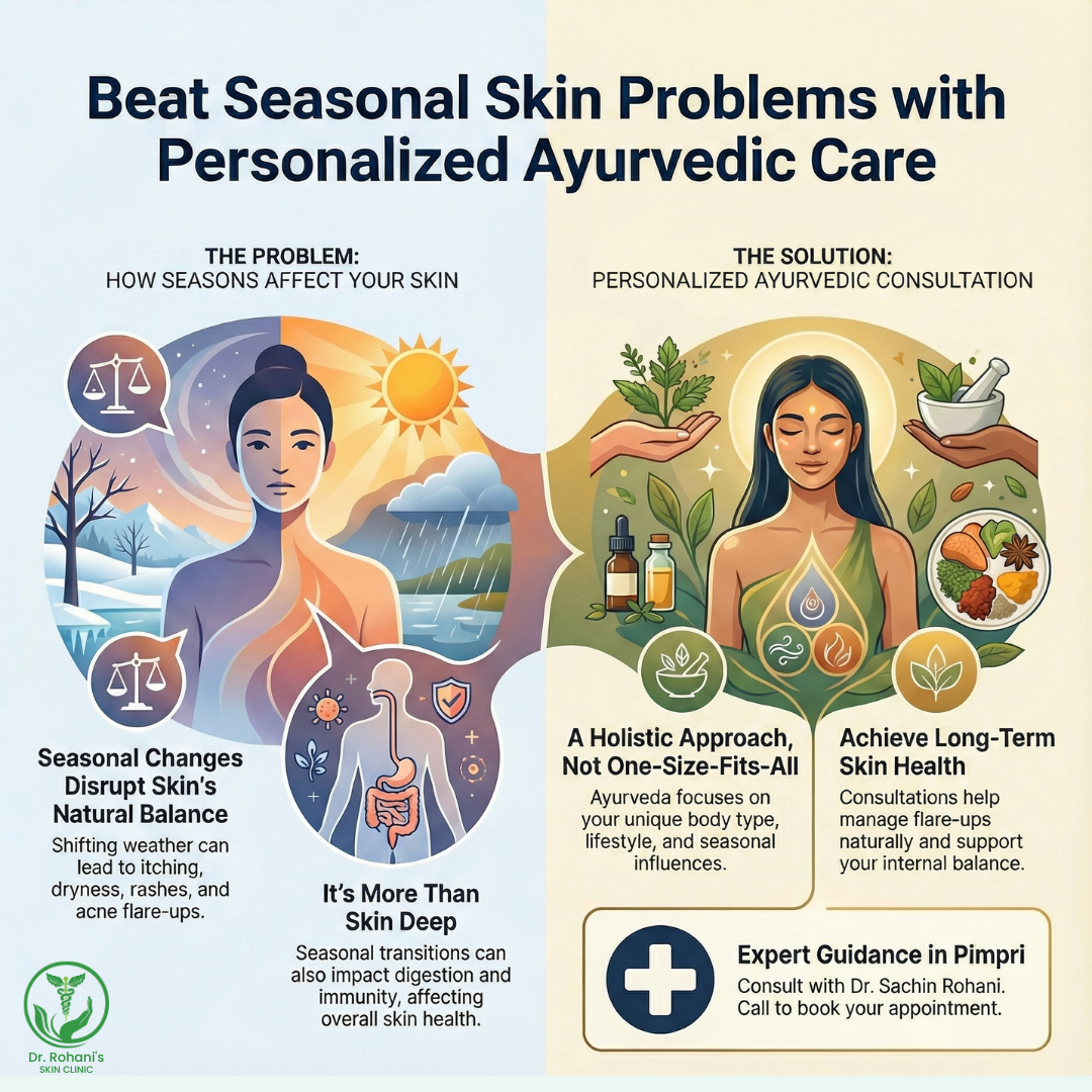 Why Seasonal Changes Affect Your Skin Changes in weather—such as increased heat, humidity, cold, or dryness—can disturb the skin’s natural balance. This often leads to itching, dryness, rashes, acne flare-ups, or worsening of existing skin conditions. Seasonal transitions can also affect digestion and immunity, which directly impacts skin health. How Ayurvedic Consultation Can Help Ayurveda focuses on understanding your body type, lifestyle, and seasonal influence before suggesting care. Through personalized consultation, Ayurvedic guidance helps in: Managing seasonal skin flare-ups naturally Supporting internal balance Improving long-term skin health with safe, holistic methods Consultation at our clinic is provided by Dr. Sachin Rohani, with a focus on individualized skin care rather than one-size-fits-all solutions. 📍 Consultation available at Pimpri clinic 🕒 Prior appointment recommended Call-To-Action 👉 Call Now to Book Your Ayurvedic Skin Consultation