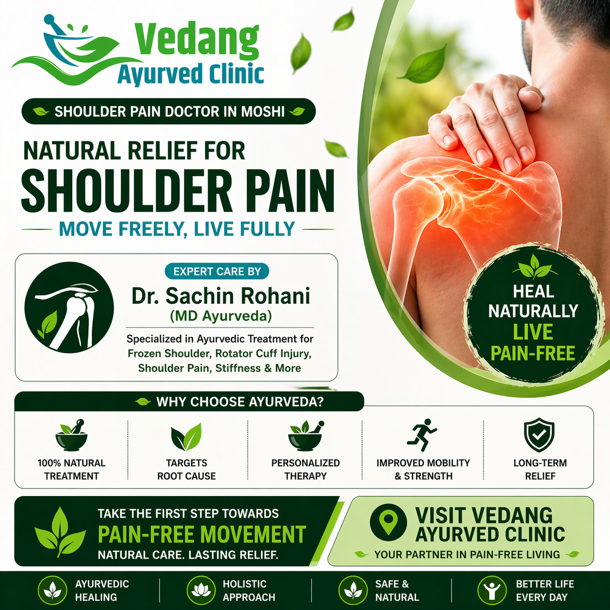 Looking for a trusted shoulder pain doctor in Moshi? Get expert, non-surgical treatment at Vedang Ayurveda Clinic under the care of Dr. Sachin Rohani (MD Ayurveda), known for delivering effective and long-lasting relief from shoulder pain through authentic Ayurvedic therapies.