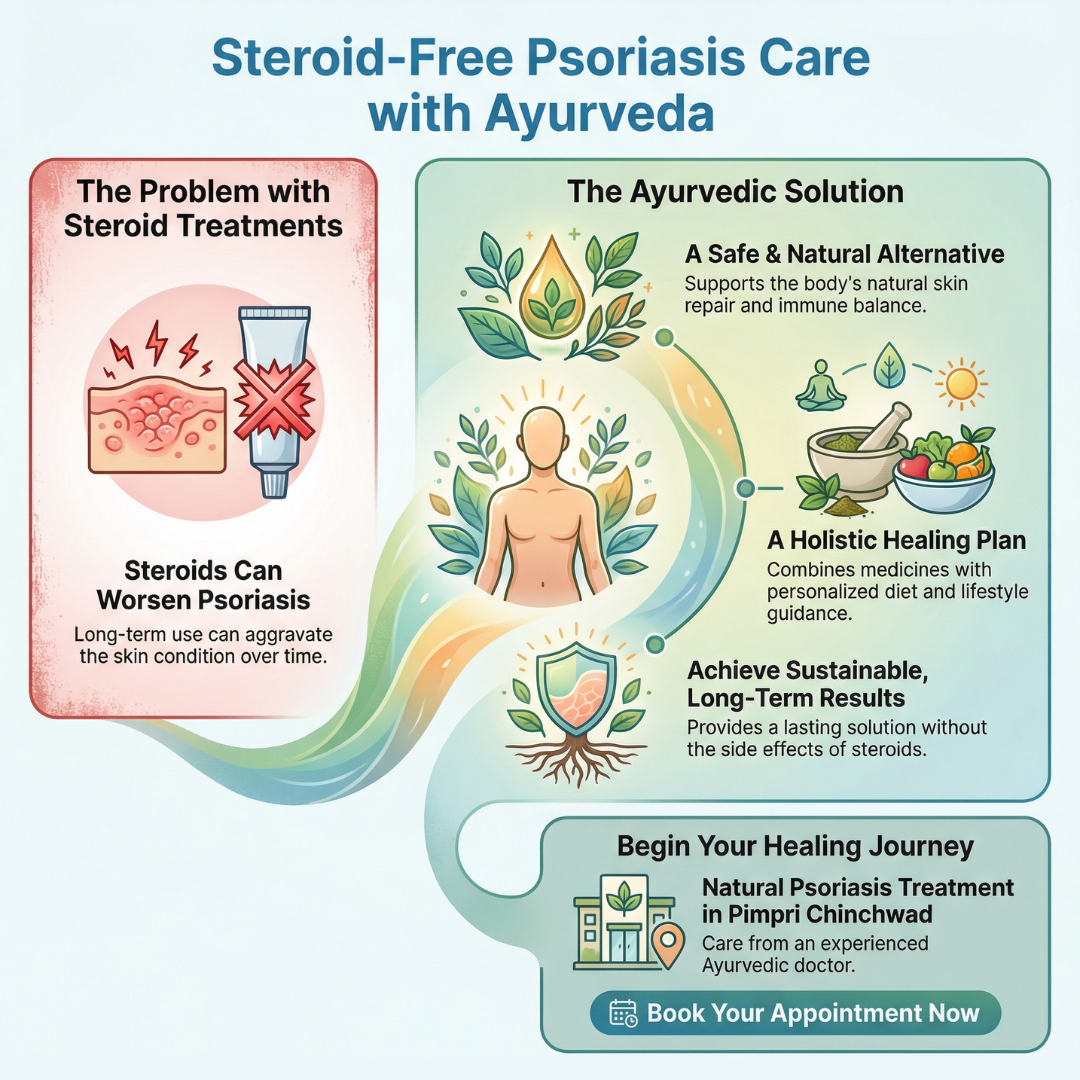 Long-term steroid use can worsen psoriasis over time. At Dr. Sachin Rohani’s Ayurvedic Clinic in Pimpri Chinchwad, Ayurveda offers a safe, natural alternative that supports skin repair and immune balance.