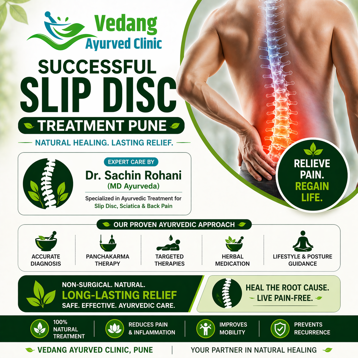 If you’re searching for successful slip disc treatment Pune, Vedang Ayurveda Clinic provides a trusted, effective, and natural solution. Under the expert guidance of Dr. Sachin Rohani (MD Ayurveda), you can achieve long-term relief, improved mobility, and a healthier, pain-free life.