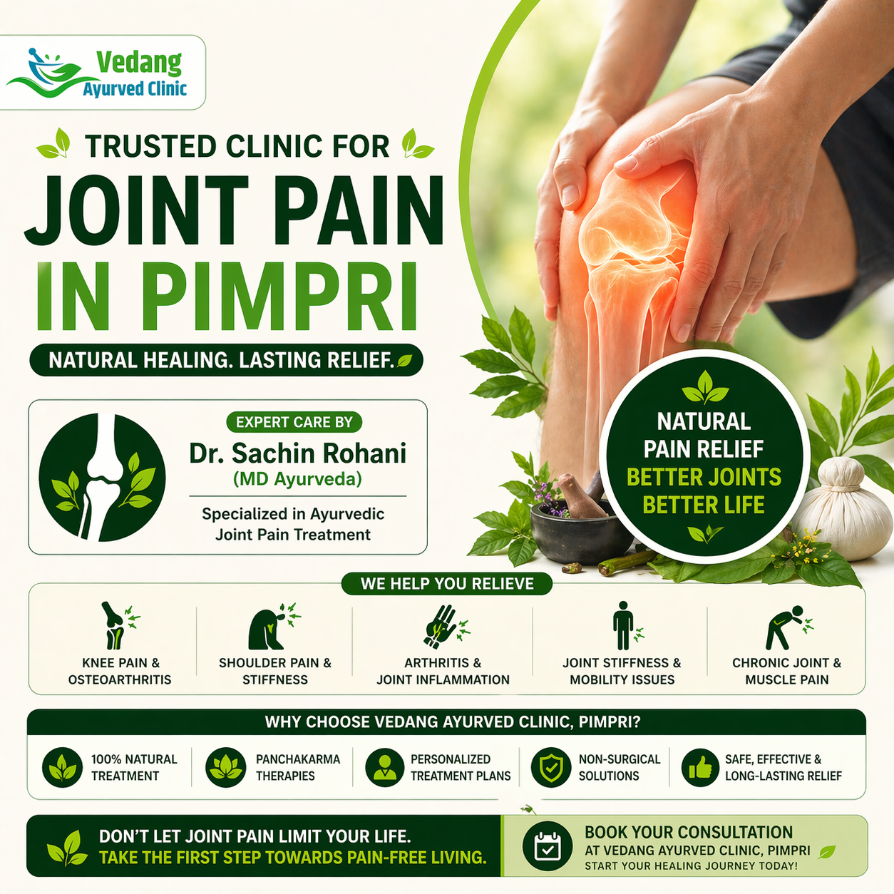 Looking for a trusted clinic for joint pain in Pimpri? Get effective, non-surgical relief at Vedang Ayurveda Clinic, where Dr. Sachin Rohani (MD Ayurveda) provides expert care for knee pain, arthritis, shoulder pain, and chronic joint conditions using authentic Ayurvedic therapies.